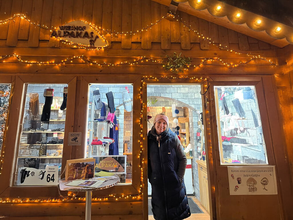 Unser Stand war täglich ab dem Vormittag geöffnet. Viele Besucherinnen und Besucher blieben stehen, nahmen die Alpakaprodukte in die Hand, fragten nach Herkunft und Verarbeitung und erzählten uns, für wen sie ein warmes Geschenk suchten. Besonders beliebt waren die weichen Accessoires, kleinen Mitbringsel und Geschenksets. Oft entstanden dabei ganz persönliche Gespräche über Alpakas, den Hof und das Leben mit den Tieren.